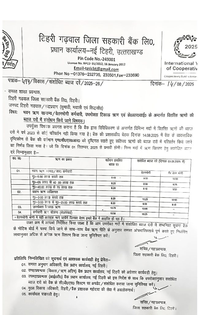 Tehri Garhwal Zila Sahkari Bank Ltd.  Reg Office :-Head Office, New Tehri, Uttarakhand-249001